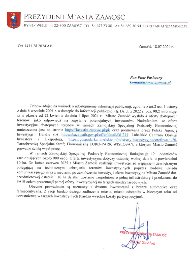 Jak widać, odpowiedź jest zupełnie nie na temat. Ale wynika z niej jasno, że Prezydent Rafał Zwolak osobiście nie wysłał żadnej oferty inwestycyjnej. Co więcej, miasto nie przejawia inicjatywy, wysyła jedynie oferty „jako odpowiedź na zapytania potencjalnych inwestorów”.