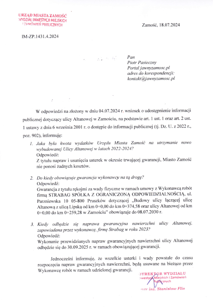– Z tytułu napraw i usunięcia usterek w okresie trwającej gwarancji Miasto Zamość nie ponosi żadnych kosztów – odpisał nam Stanisław Flis, dyrektor Wydziału Inwestycji Urzędu Miasta Zamość. – Gwarancja obowiązuje do 8 lipca 2030 roku.