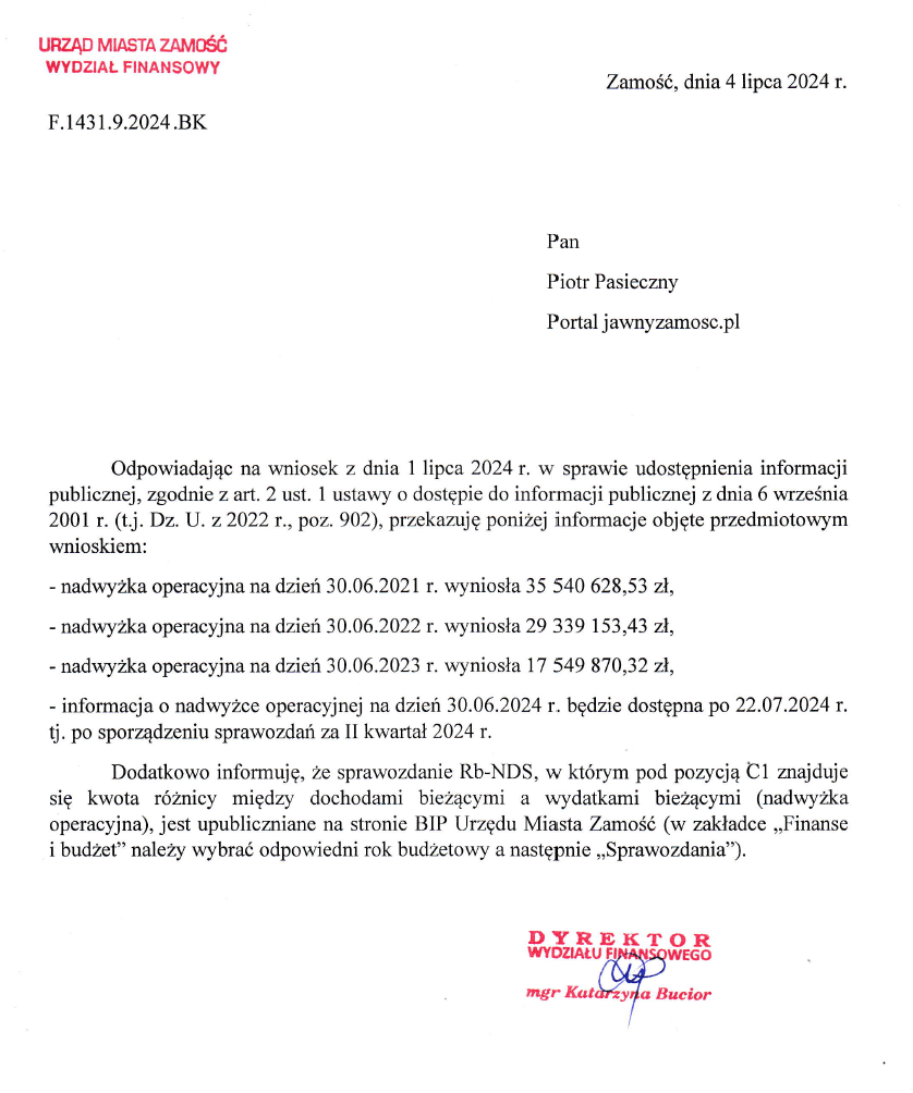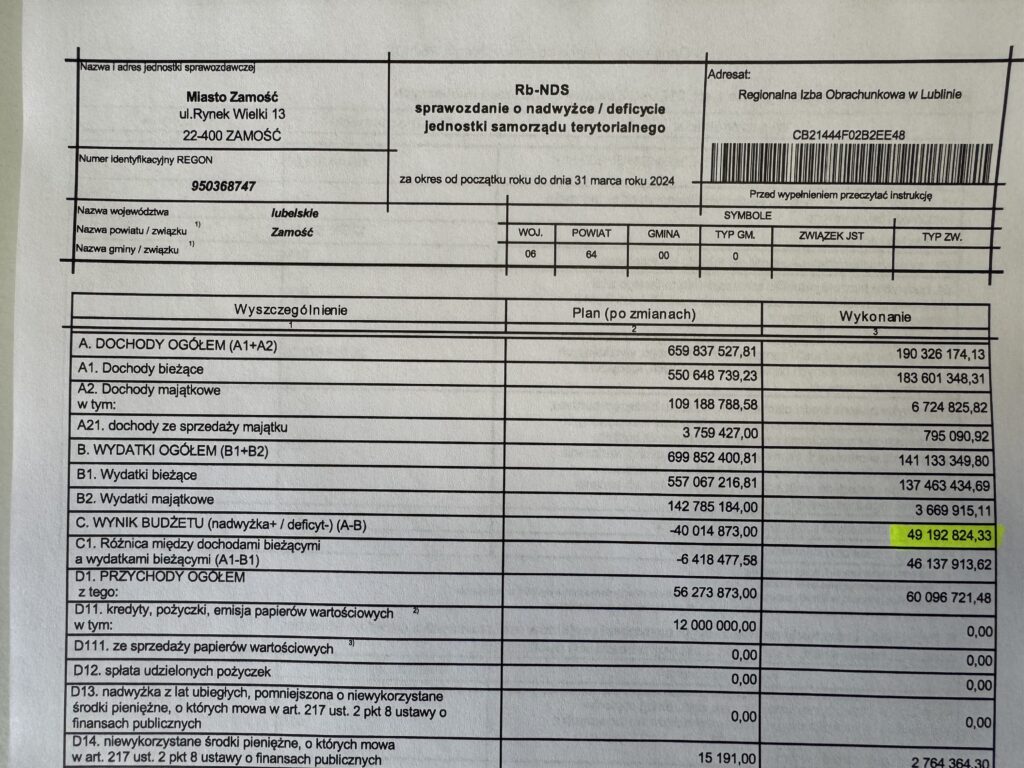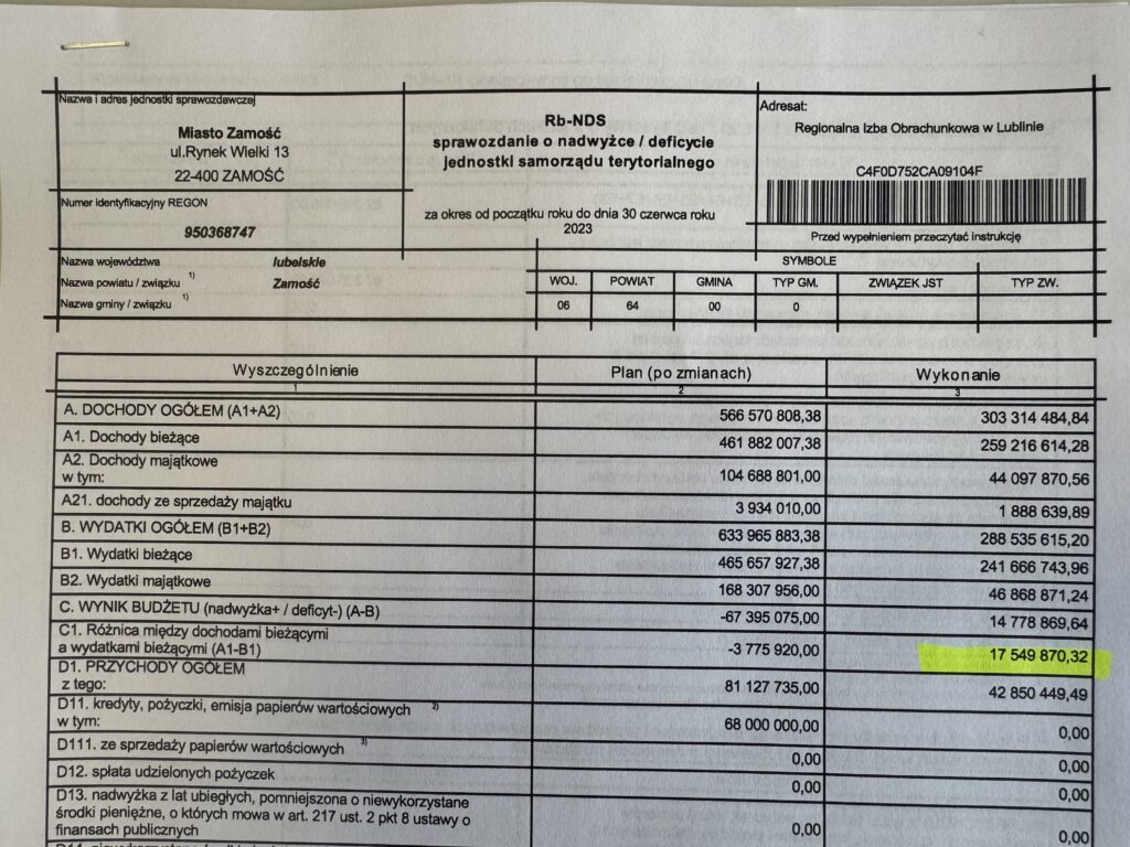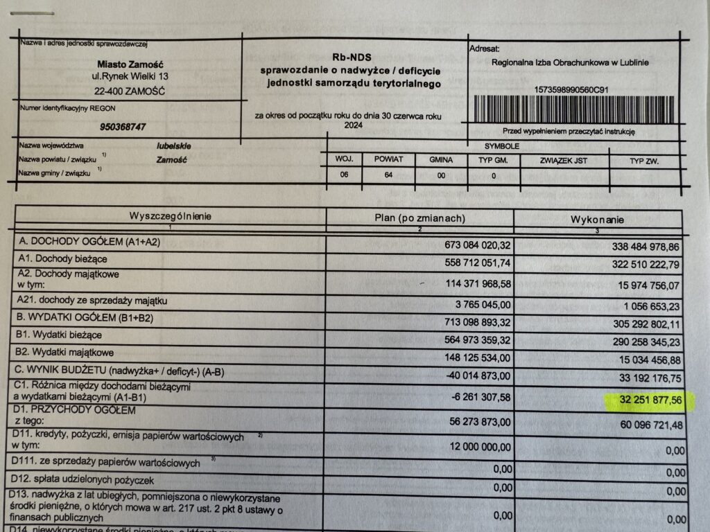 Sprawdziliśmy więc sprawozdanie finansowe, opublikowane w Biuletynie Informacji Publicznej. Wynika z niego, że po pierwszym półroczu Zamość miał rekordową nadwyżkę na rachunku obrotów bieżących, prawie dwukrotnie większa niż rok temu. Po pierwszym półroczu 2023 roku było to 17,5 mln zł, teraz jest 32,3 mln zł.