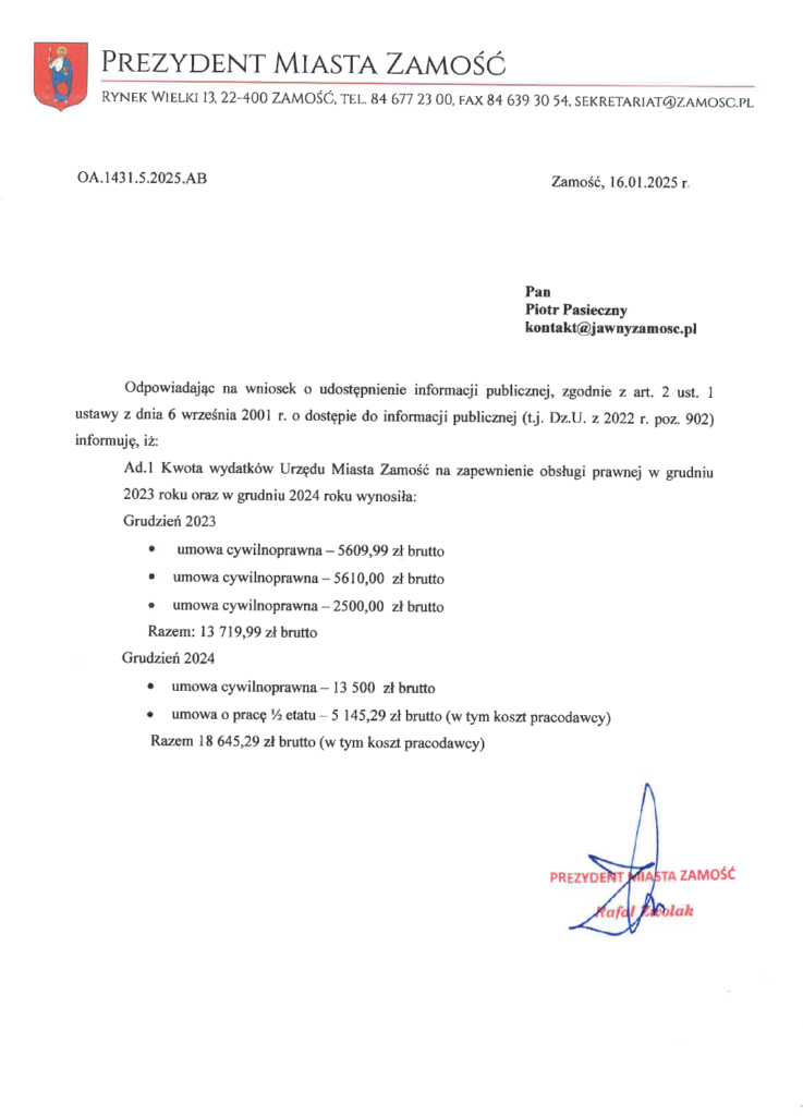 Jednak nie wszyscy mają powody do narzekania. Spore podwyżki otrzymali przecież nauczyciele, pracownicy socjalni, a także radcowie prawni obsługujący urząd. Już pod koniec sierpnia na łamach Jawnego Zamościa zwracaliśmy uwagę, że koszt obsługi prawnej urzędu wzrósł o 2 tysiące miesięcznie. Koniec 2024 roku okazał się być jeszcze gorszy.