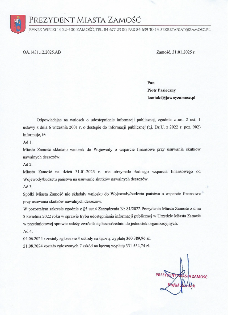 Po kilku miesiącach postanowiliśmy sprawdzić, co udało się miasto uzyskać od wojewody czy ministerstw. Zapytaliśmy Urząd MIasta, na które zadania i jaką kwotę miasto otrzymało. Okazało się, że Miasto Zamość po ulewnych deszczach w dniu 5 czerwca i 21 sierpnia 2024 roku składało wnioski do Wojewody o wsparcie finansowe przy usuwaniu skutków nawalnych deszczów. Jednak na dzień 31 stycznia 2025 r. takiego wsparcia nie otrzymało.