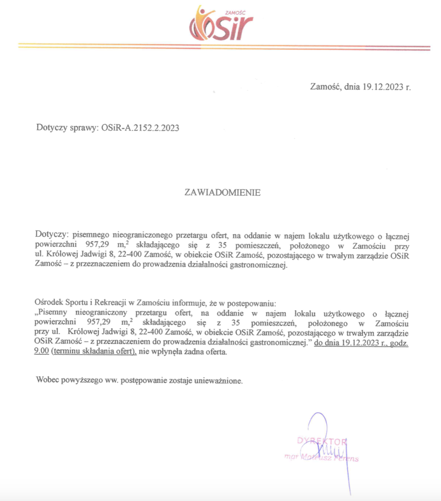 Po raz pierwszy restaurację OSiR przeznaczono do najmu 28 listopada 2023 roku. Precyzyjnie, był to pisemny przetarg nieograniczony ofert, na oddanie w najem lokalu użytkowego o łącznej powierzchni 957,29 m2, składającego się z 35 pomieszczeń, położonego w Zamościu przy ul. Królowej Jadwigi 8.
