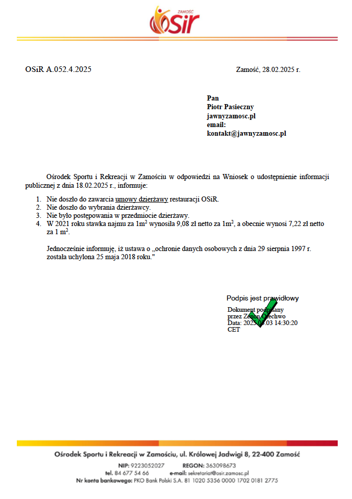Zadaliśmy pytanie dyrekcji OSiR na temat trybu i warunków wynajmu tych pomieszczeń. W piśmie (skan poniżej) nie otrzymaliśmy żadnej precyzyjnej informacji co do najemcy. Dyrektor Zenon Orechwo najprawdopodobniej uważa, że jeśli dzierżawa i najem to są dwie różne umowy, to nie ma obowiązku informowania opinii publicznej o fakcie najmu.