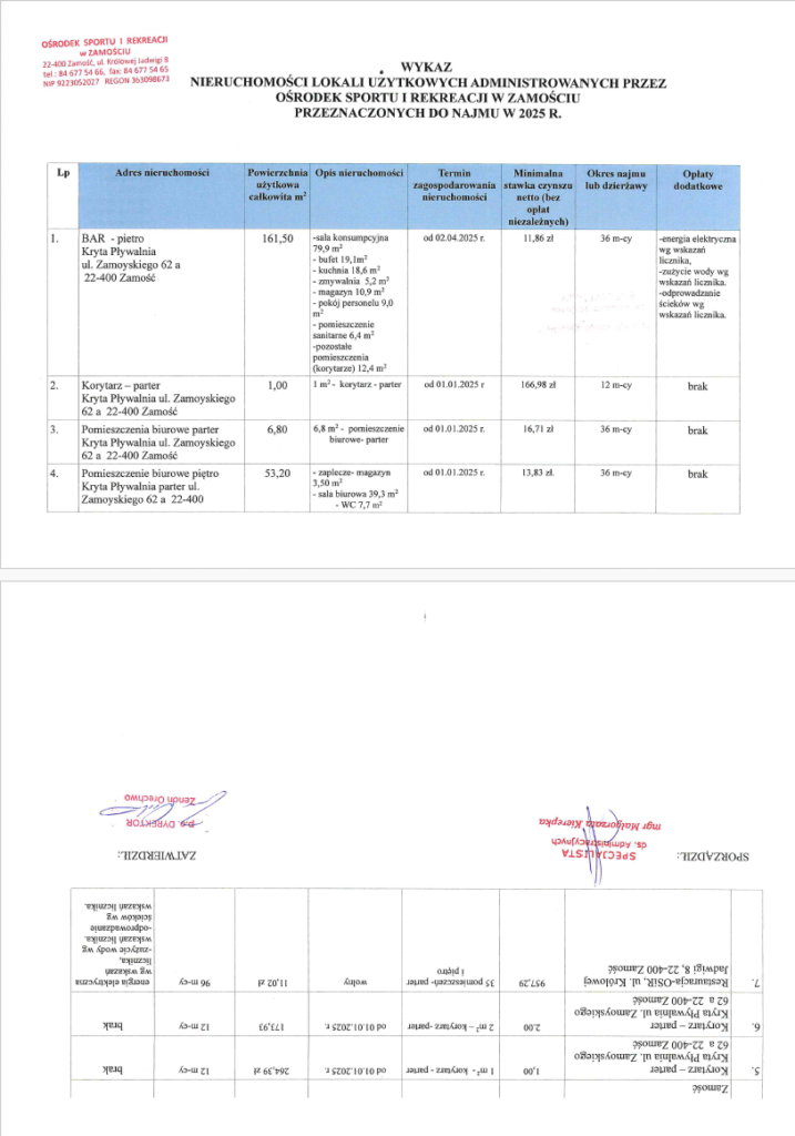 Oto bowiem 27 października na stronie Biuletynu Informacji Publicznej OSiR ukazał się dokument o nazwie „Wykaz nieruchomości i lokali użytkowych administrowanych przez Ośrodek Sportu i Rekreacji w Zamościu przeznaczonych do najmu w 2025 roku”. Pod pozycją 7 umieszczono ofertę najmu restauracji. Oczekiwana cena to 11,02 zł netto za m. kw. powierzchni.